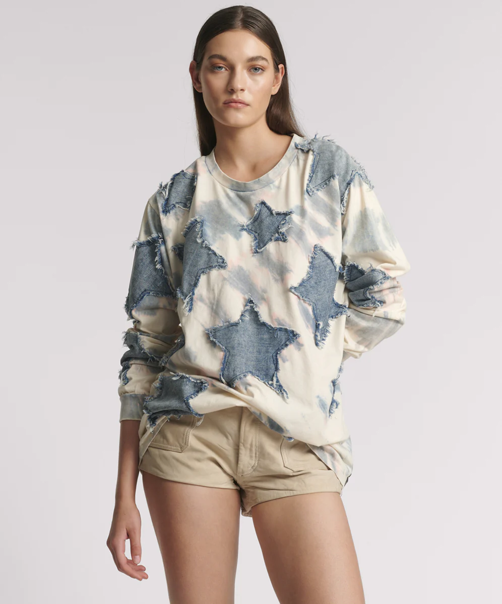 The stars are aligned in the DENIM STAR TIE DYE BOYFRIEND LONGSLEEVE TEE.