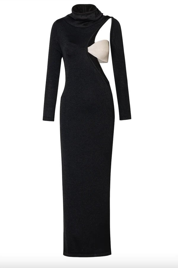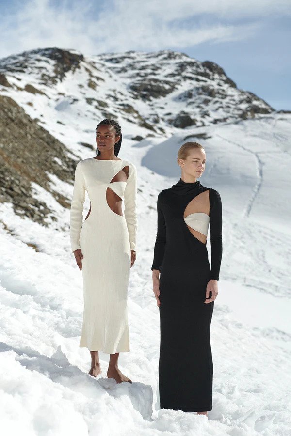 The Frida dress is a sculptural wonder, the maxi dress of your dreams. This sophisticated, long-sleeve silhouette features textured fabric and cutout details, making it a classic staple. The high neck and long sleeves play with two different colors, creating the perfect dress. Please note that the cream top comes separately.