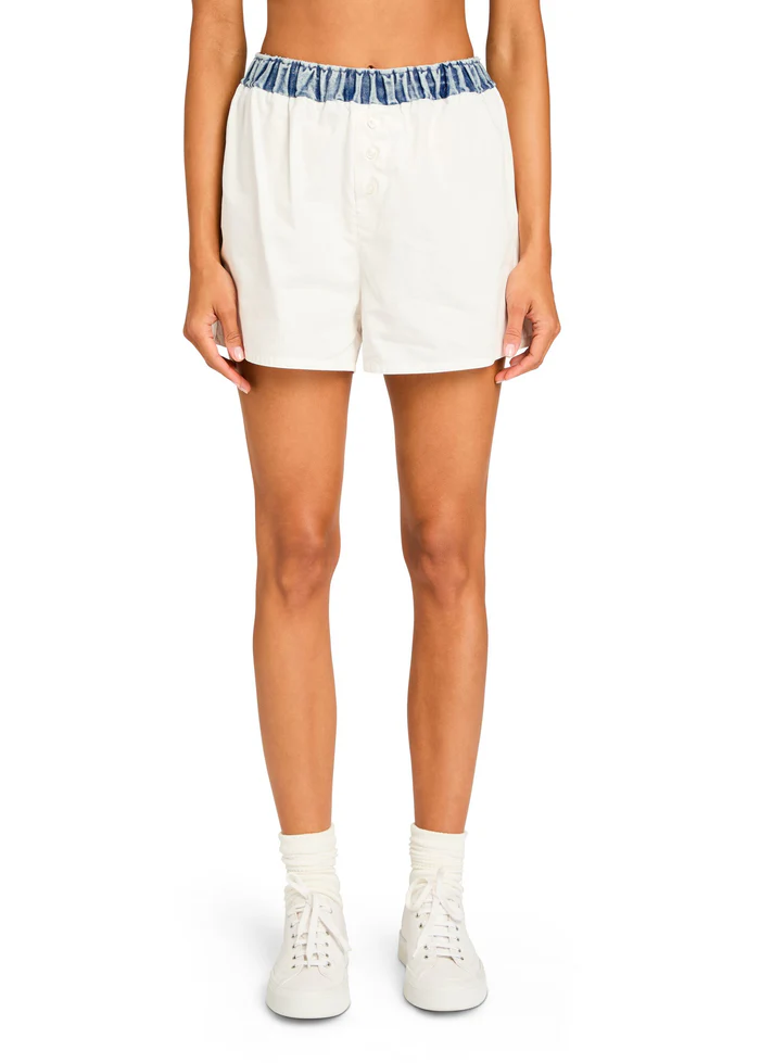 Oversized button down shirt with denim collar and placket detail. Pair with the Tama Boxer Short for a matching set moment. Shown here in White/Coastline.