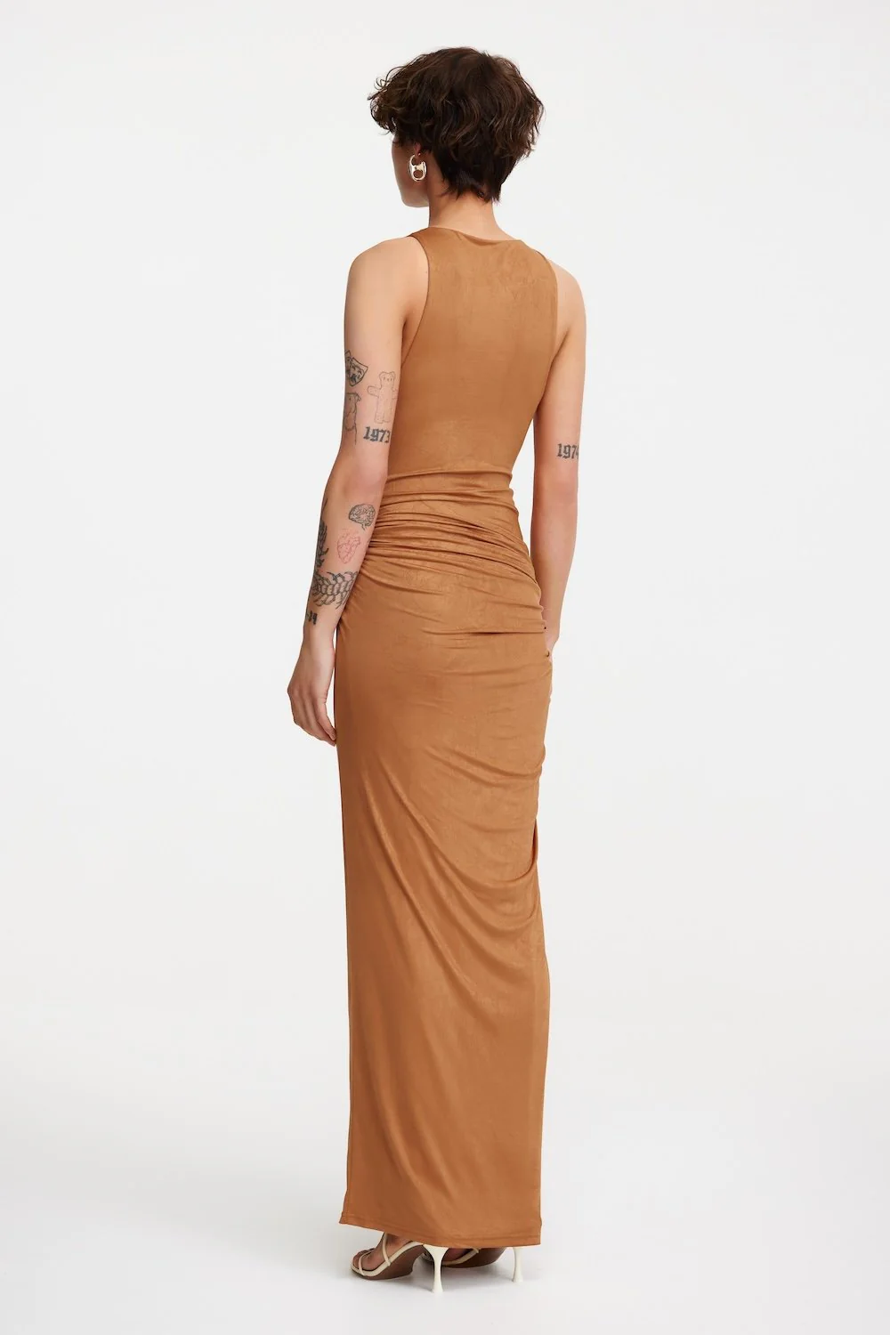 In a sophisticated silhouette, the Nala Dress in Cinnamon is crafted from wet-look crinkle jersey for a unique finish. Featuring a high cowl neckline and a gathered skirt that twists at the front hip with stacked ring hardware, this piece creates a sleek and sculptural silhouette. A subtle split under the twist detail adds a hint of allure, making it perfect for evening events or special occasions.