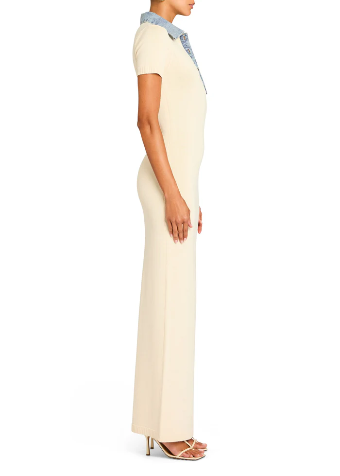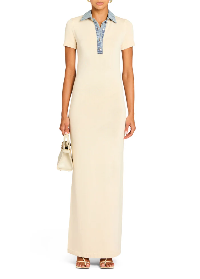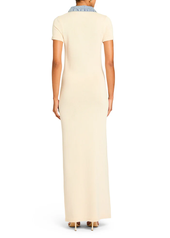 Polo style, knit maxi dress with denim collar detail. Shown here in Eggshell/Coastline.