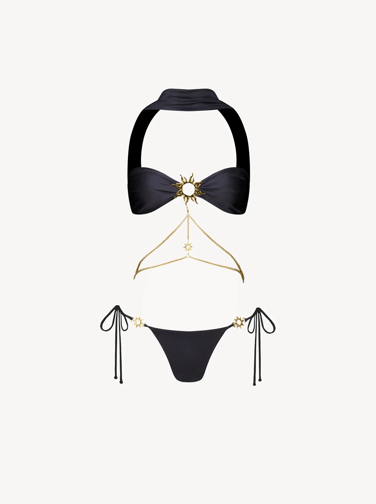 Sculptural bikini with a golden body chain and sun-shaped detail.